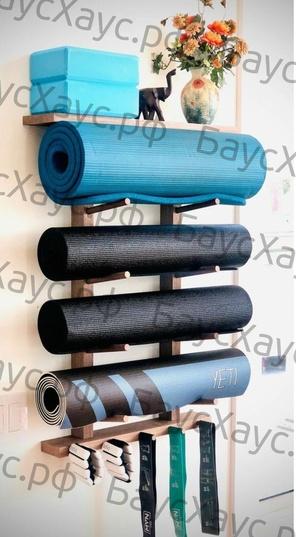 Стеллаж (полка-держатель) для хранения фитнес (йога) ковриков 5 мест с дополнительными полка для инвентаря Полка выполнена из массива Ольхи Длинна 90см Расстояние между полками 17 см Вылет от стены 18см Размер полки 60смХ10смХ2см Крепеж в комплекте При желании можете самостоятельно покрыть лаком или маслом (в комплект не входит)